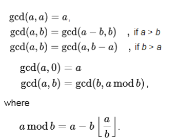 - 핵심 아이디어: 두 수의 GCD는 그 차의 GCD와 같다, 또는 gcd(a,b)=gcd(b,amod b)로 계산