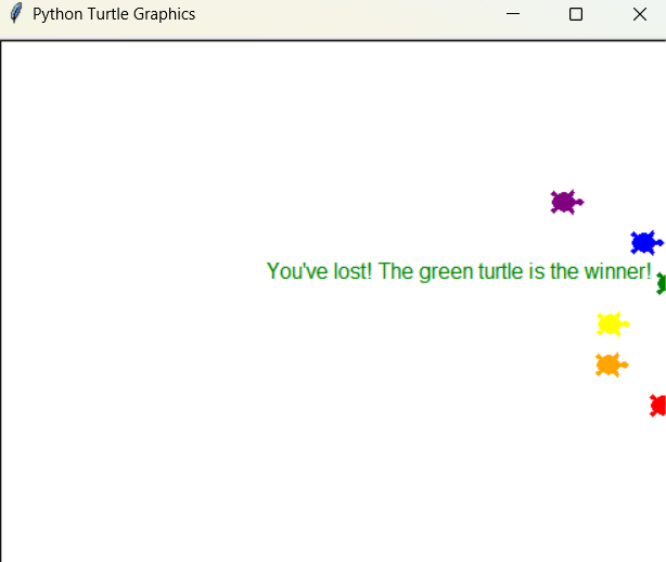 turtle.write(f"You've lost! The {winning_color} turtle is the winner!", align="right", font=("Arial", 12, "normal"))